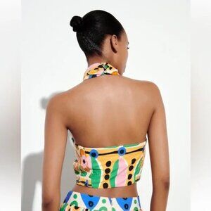 Crossover halter neck and exposed shoulders. Smocked elastic detail on side.