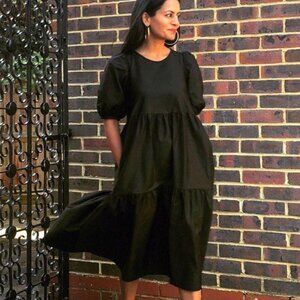Zara Poplin Tiered Puff Sleeve Midi Dress Black Size XS