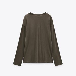 Top made from premium cotton. Round neck and long sleeves. Front draped fabric detail. Gray green. Size XL