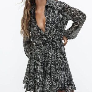 Zara Printed Mini Shirt Dress S Black White Polka Dot Flared Skirt