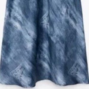 Brand new beautiful silky blue printed dress, strappy, low back, pull-over styling, slight A-line shape at bottom. Unique printed pattern, sold out online.