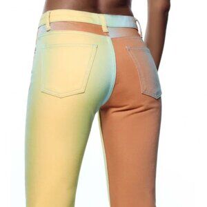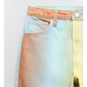 NWOT Zara mid rise five pocket jeans in rigid fabric. Front metal button closure. Fun and funky muticolored free form gradient heatmap print.