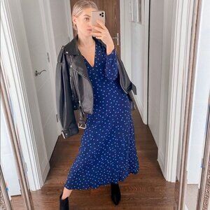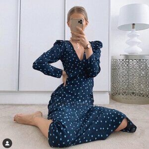 Zara Puff Shoulder Polka Dot Midi Maxi Dress Blue Size Large