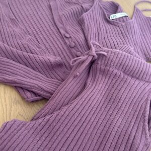 Stylish ribbed knit set. Includes cardigan, top, and pants. Comfortable and chic. top and cardigan are a medium and pants are a large.
