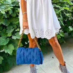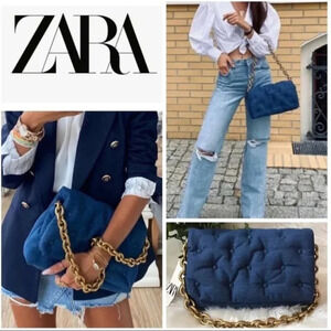 Zara Quilted Padded Blue Denim Shoulder Bag Purse Chunky Gold Chain Handle