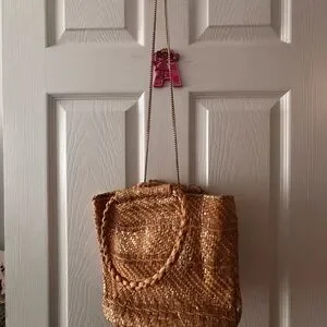 Chic raffia bag with braided handles. Ideal for everyday use and vacation/summer time! Great with casual outfits! Includes a chain strap for crossbody wear!