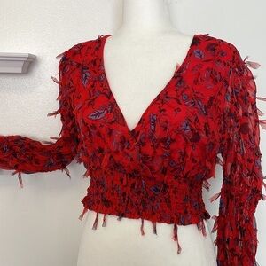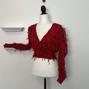 Top is fringed sheer polyester cropped bright red and blue floral design giving this top major bohemian vibes.