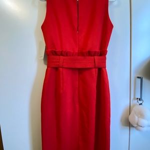 Midi Red dress with V neckline and tie at the waist, black stitching.