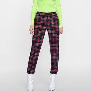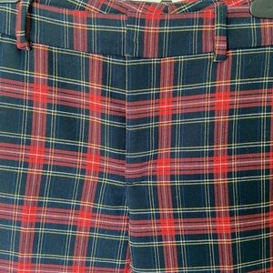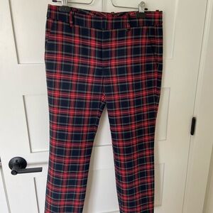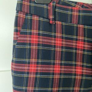 Bold plaid design with a modern fit. Perfect for stylish occasions. Red, navy, yellow and white plaid design. Ankle length.