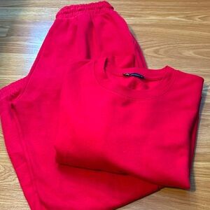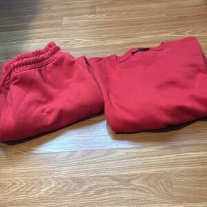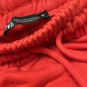 Looking for a chic and comfy outfit? This bright red Zara tracksuit is a must-have! The set includes the top - classic crew neck top and matching bottoms with an elastic waistband for a comfortable fit. This tracksuit is in excellent condition and ready for a new owner.