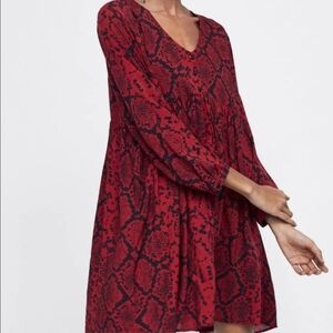 This elegant red sundress from Zara is designed for a stylish night out. It features a flattering v-neckline and graceful bishop sleeves, offering a perfect blend of sophistication and comfort. The dress's vibrant color and chic style make it an ideal choice for cocktail occasions.
