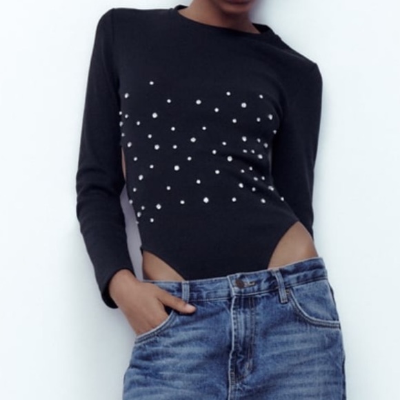 {Zara} Rhinestone Cut Out Ribbed Bodysuit • S