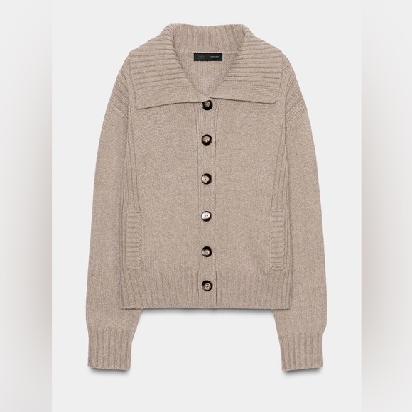 Chic Zara sweater with button-up front and wide collar. Camel in color. Ideal for layering.