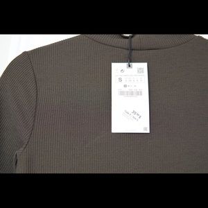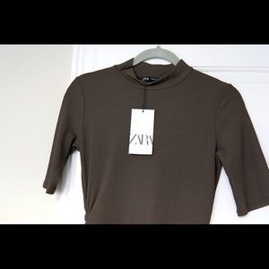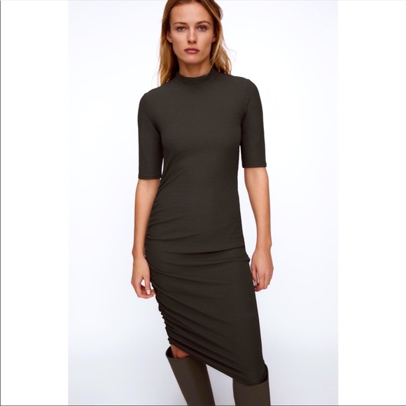 Zara Ribbed Dress with collar. Hunter green colour. Side ruching.