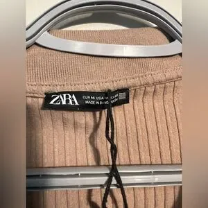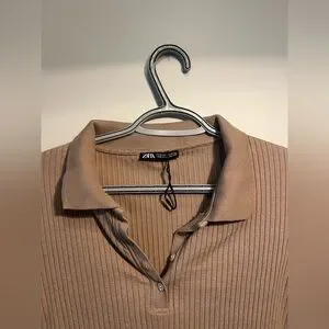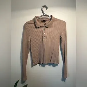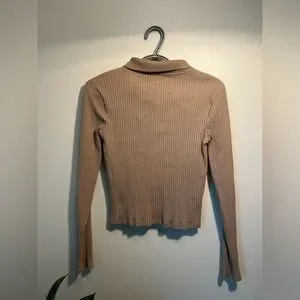 Elevate your wardrobe with this stylish ribbed tan long sleeve top. Perfect for any occasion, this top features a classic collar and a comfortable fit.
