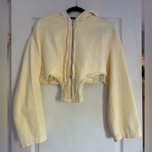 Brand new, worn once. Yellowish tint color, frayed hem, corset inspired hoodie/jacket. Size small, runs large! Will fit a medium or large.