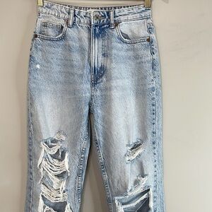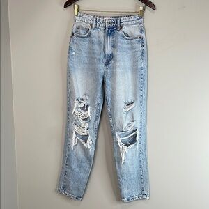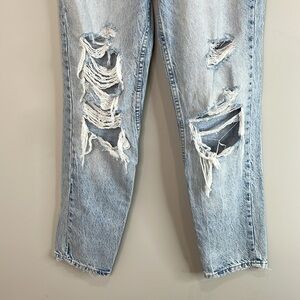 Women’s blue light wash denim Zara Ripped Distressed Ultra High Waist Mom Jeans.