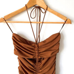 Zara Ruched Cut Out Halter Tie Mini Dress Brown Size Medium