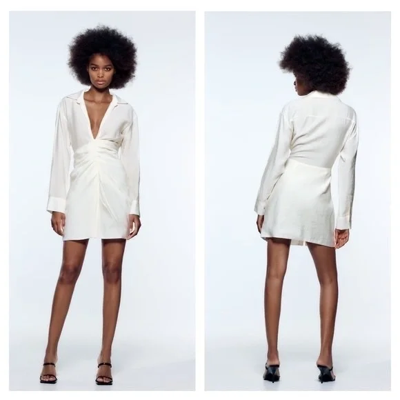 Zara linen-like ruched long sleeve dress in colour off white, size small - Purchased for $60 - Never worn, brand new with tags attached