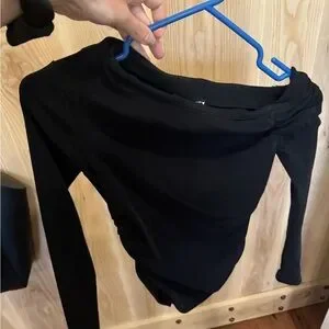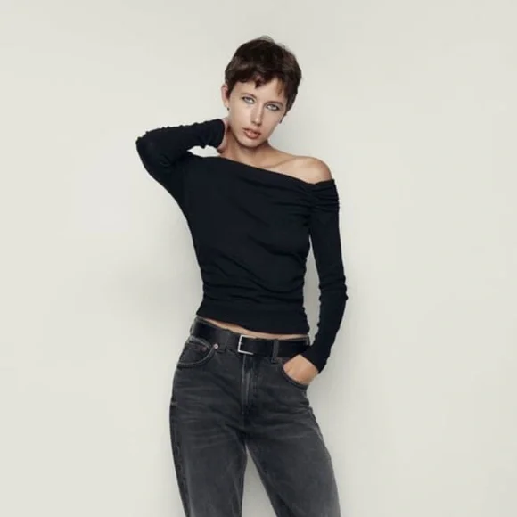 Selling a Zara off-shoulder top with side ruching in the colour black! Size small