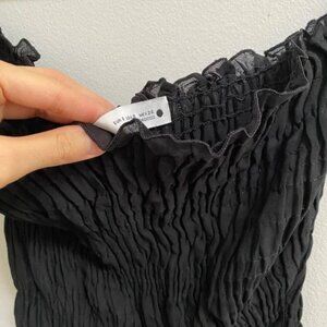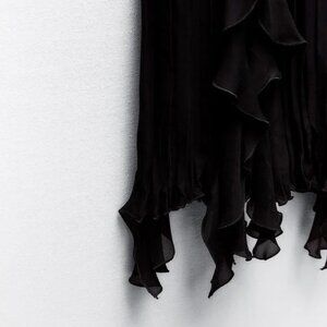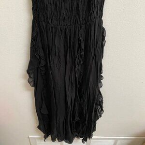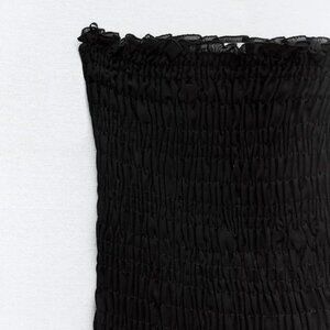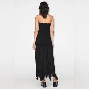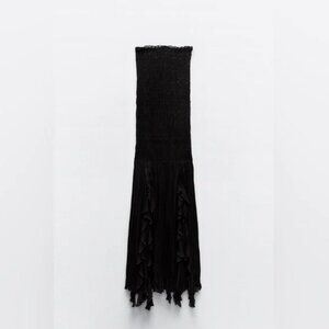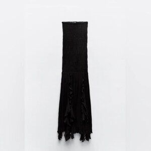 Zara long strapless dress made of 100% viscose. Smocked elastic detail. Asymmetric hem with self ruffle.