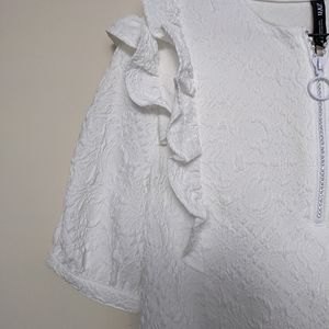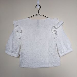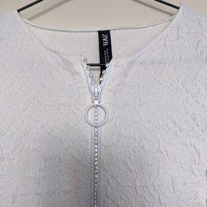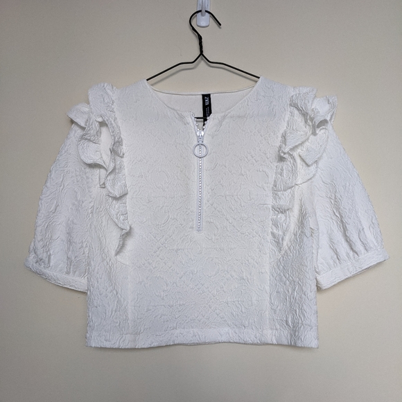 Zara Ruffle Shoulder Cropped Length Blouse with gemstone zipper detailing.