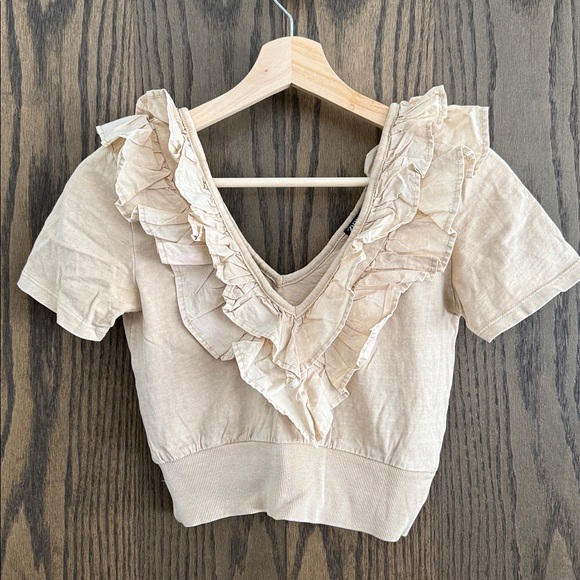 Crop top with deep V neck and ruffle from front to back. In a washed out sand colour with ribbed stretchy fabric. Size small but fits XS - S. Super sexy.