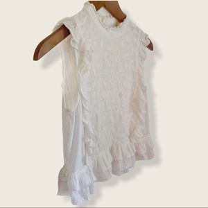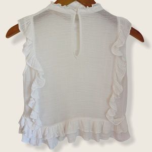 Zara off-white blouse in a soft, light, gauzy fabric. Romantic details with ruffles and embroidery. Slight crop length. Excellent condition.