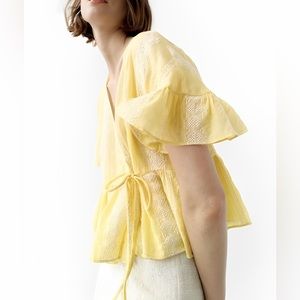 Zara Ruffled Sleeve Embroidered Peasant Wrap Top Yellow Size Medium