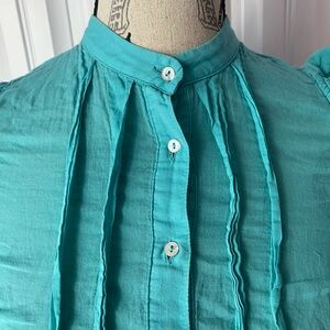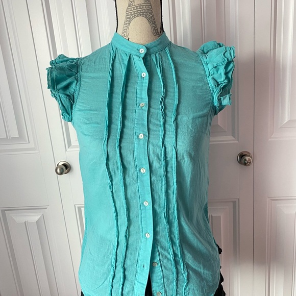 Elevate your style with this chic turquoise blouse. Featuring elegant ruffles and a button-up design, it's perfect for any occasion.