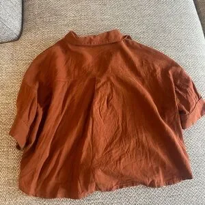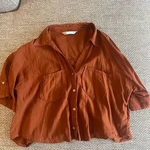 Chic rust button-down shirt by Zara. Features short sleeves and front pockets. Ideal for casual wear.