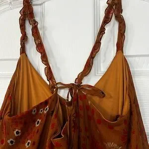 Elegant rust maxi dress with floral pattern. Sleeveless design. Perfect for casual outings.