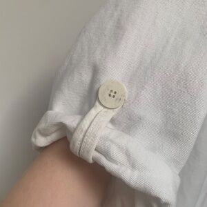 This easy summer jumpsuit is a blend of cotton (45%), lyocell (35%), and linen (20%). Interior drawstring helps define waist. Short sleeve, buton-up with pockets.