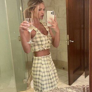 Zara SET Textured Tweed Plaid Crop Top + Skirt Yellow Black Size XS