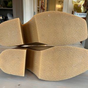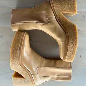Gorgeous tan leather with elasticized inset. Square toe, buckle strap detail; side zip, chunk heel and platform crepe sole. Excellent condition. Like new!