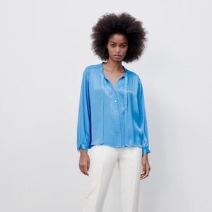 Elegant women’s Zara satin effect bow tie neck business casual blouse that features a tied round collar, a v neckline, long sleeves, and a button front closure.