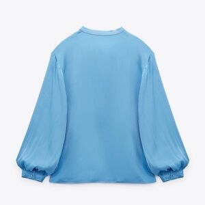 Zara Satin Bow Tie V-Neck Long Sleeve Button Up Blouse Chic | Sky Blue | Medium