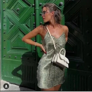 Zara Satin Effect Paisley Slip Mini Dress Green Gold Size Medium