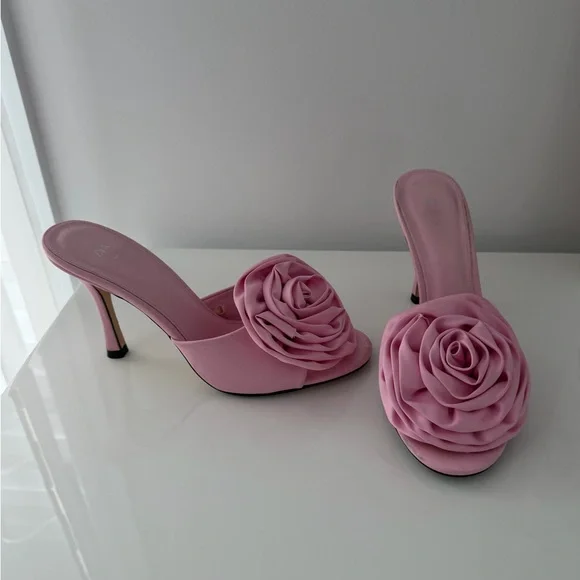 Absolutely stunning Zara satin high heel slides featuring a bold oversized rose detail. These are such a statement piece and instantly elevate any outfit.