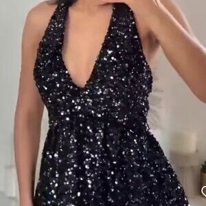 Zara Sequin Balloon Halter Mini Dress NWT Black Silver Size Medium