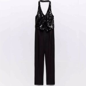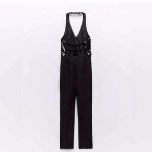 Zara Sequin Vest Halter Jumpsuit Open Back V- neck Black size S