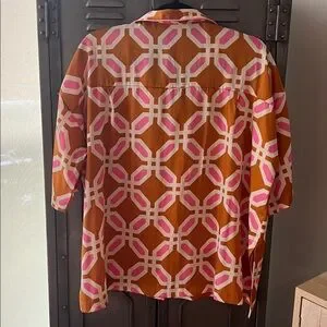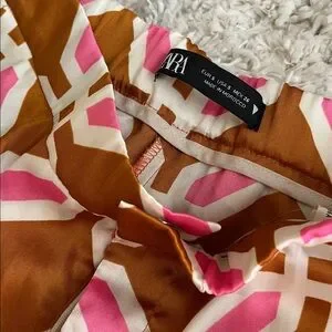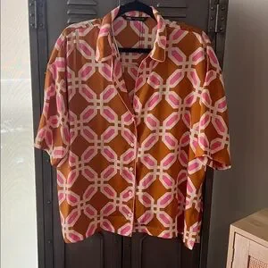 Stylish Zara shirt with bold geometric design. Features pink and brown colors. Perfect for casual wear. Top oversized XS (fits a S, and M),
