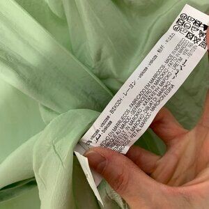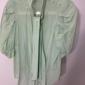 Shimmery satin viscose sheer blouse in sage green. Neck tie, button up. Button sleeves. Small shoulder pads. Excellent condition.