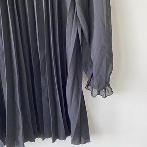 Babydoll style dress with a high collar, small button closure at back, elastic wrists.