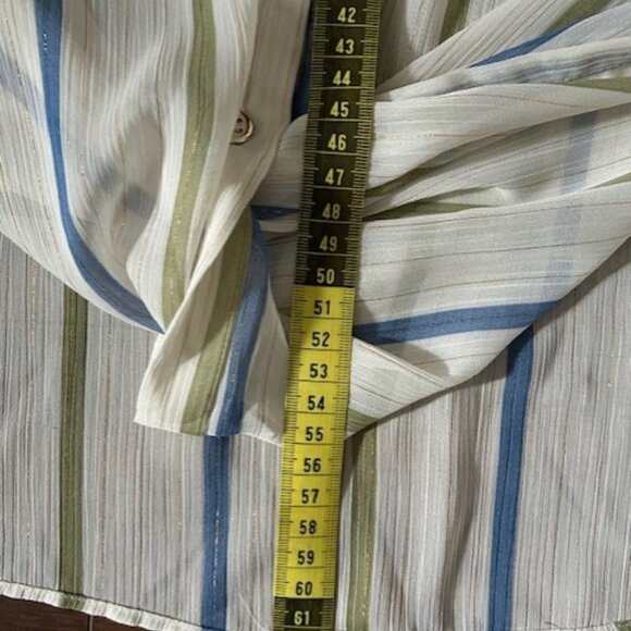 Sheer fabric with golden metal thread, loose fit, size M, never worn, tag removed.