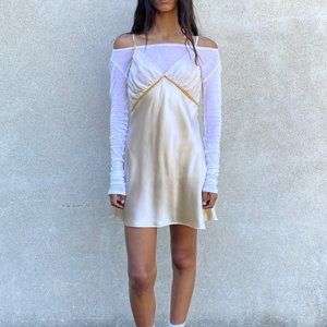 Zara short dress made of mulberry silk blend fabric. Lingerie style. V-neck with adjustable cross-back spaghetti straps. Contrasting soft lace trim. A-line silhouette.
