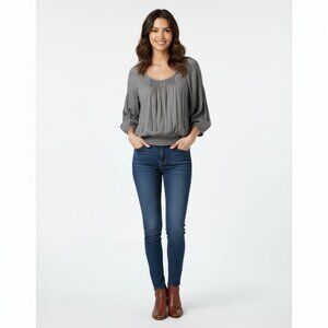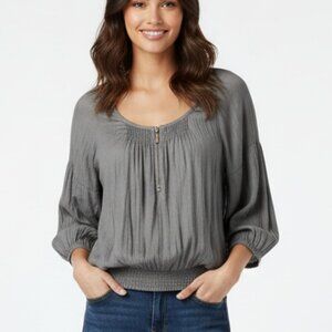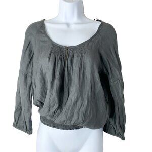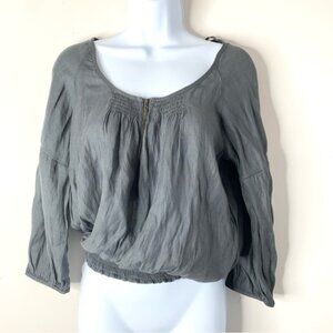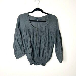 Zara Smocked Peasant Blouse Top Cropped 3/4 Length Sleeve Dark Gray Zip Size M