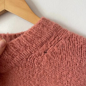 Tiny stretched knit hole by neck (pictured) - really not noticeable but disclosing for transparency, otherwise sweater is in excellent condition