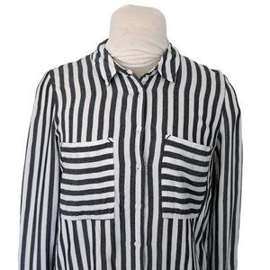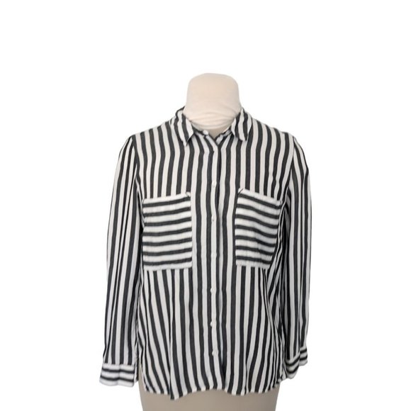 This is a black and white striped button down shirt by Zara Basic Collection. Made from a lightweight fabric with a slight sheen to it.