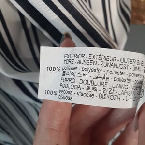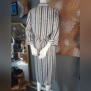 Elegant black and white striped button down midi dress from Zara. Perfect for any occasion. Features a stylish tie-front fabric belt design for a flattering fit. Worn only once, no flaws to note. Collared with long sleeves, buttons at cuffs. Polyester and viscose fabric, very satin like texture. Size xs, but is billowy so could fit small too imo! See flat lay measurements below!